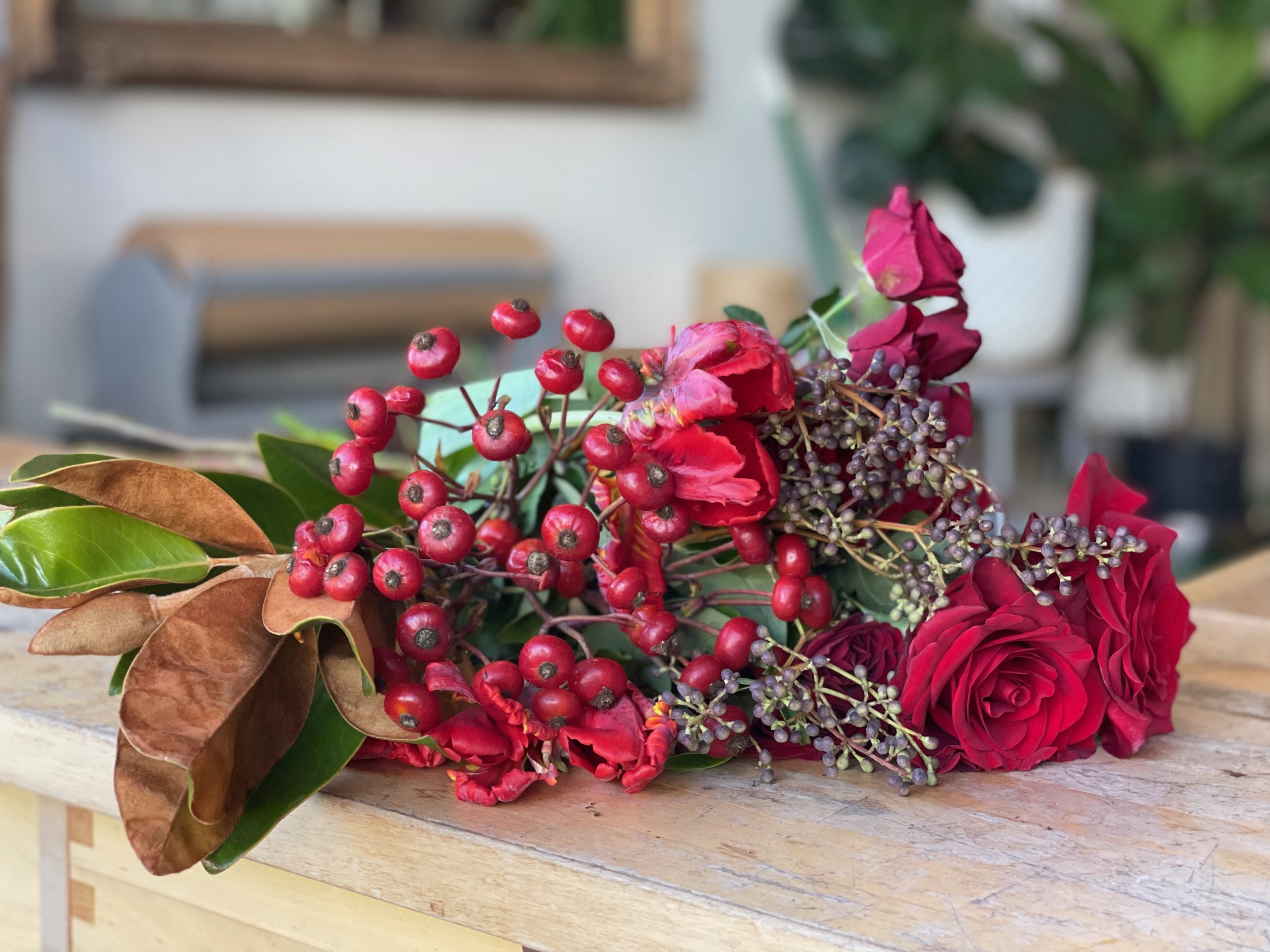 Burst & Bloom’s winter bouquets make for stunning centerpieces throughout the holiday season.